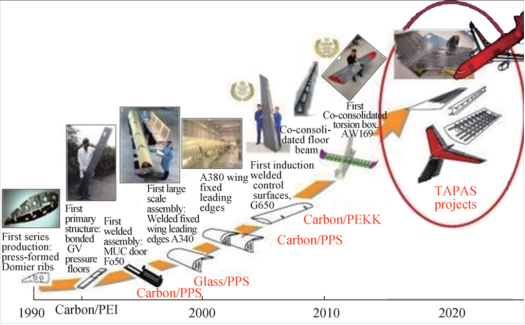 图4 高性能热塑性复合材料在民用航空应用中的发展历程