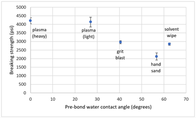 热塑性聚合物的行为,由于聚合物链没有通过交联锁定在刚性网络中,因此它们在磨损下往往会流动(换句话说,塑性变形 ),而不是断裂。虽然磨损的热塑性复合材料可能很粗糙,但它仍然不具有化学反应性,无法与粘合剂、涂层或密封剂建立良好的粘合。此外,这些表面上的水接触角通常不会因磨损而发生显著变化。对于热塑性复合材料,等离子处理可以成为增加表面能的有效方法。上图显示了与 Solvay 377S 薄膜粘合剂粘合的 PEKK 的搭接接头强度(垂直轴)与接触角(水平轴)。根据数据,在这种情况下,溶剂擦拭、手工打磨和喷砂处理并没有提高接头强度,而等离子处理使强度提高了 30% 以上。此外,等离子处理的样品在粘合剂中发生内聚失效,而其他样品在粘合剂和基材之间的界面至少部分失效。
