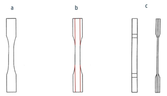 对于单向复合材料的拉升实验,通常在夹紧区域(图1c)将端片粘接到试样的顶部和底部表面,以产生比中心试验部分更大的横截面积。