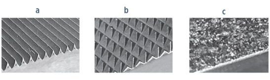 夹具巧妙设计的10-15°楔角,能将试验机施加的拉伸载荷线性转化为强大的夹紧力。考虑到不同强度与厚度的复合材料试样对夹持力的要求各异,夹具通常配备多样化的夹持表面。其中,直锯齿表面(图2a)具有最高的负载传递效率,其锋利锯齿能深深嵌入试样,实现高效载荷转移,对于稍有表面不平整的试样也能良好适应。相比之下,加工成菱形网格图案的交叉影线锯齿(图2b)齿型更圆钝,虽然咬合深度不如直锯齿,但在夹持表面相对平整的条件下,依然能保障优异的高载荷引入能力。而对于那些侧重保护试样表面、载荷引入要求相对适中的场景,特别是面对表面较为光滑平整的试样,布满60-100目碳化钨硬质颗粒的涂层表面(图2c)是理想之选,它在提供足够摩擦力的同时最大程度减少了对夹持区域的损伤。当然,在载荷引入需求较低的情况下,无粘结的高性能摩擦垫片也可作为一种实用的补充方案。