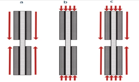 压缩试验需要类似的调整,像拉伸试样一样,压缩试样可以通过拉片表面进行拉片和剪切加载(图3a)。最常用的剪切加载压缩试验方法,ASTM D34102,使用测试夹具楔形夹紧面上的直锯齿来引入负载。此外,压缩试样可以是端部加载的(图3b)。对于许多复合材料来说,在中心试验段出现所需的压缩破坏之前,需要使用粘接片来避免试样端部的压碎或张开。粘接的翼片用于增加试件端部的承载面积,引入试件翼片的压缩力通过沿翼片长度方向的剪切应力转移到复合材料试件中。