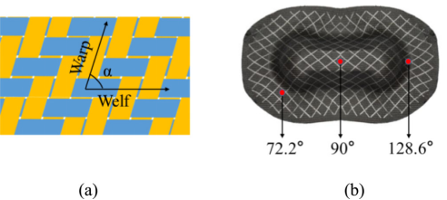 图一:(a)编织复合材料纱线角度的定义;(b)成型和固化后编织复合材料结构纱线角度的分布[1]
