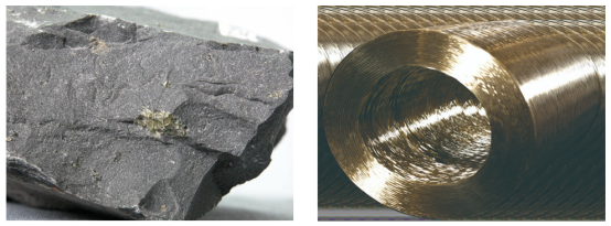 图1 玄武岩矿石(左)与成卷纤维(右)对比图