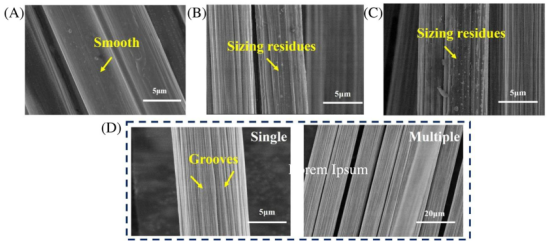 图2 (A)未处理CF SEM;(B)(C)分别为4009C160:,4009C/1205红外加热去浆工艺下的SEM;(D)为4259C160s红外去浆工艺下单根和多根CF的SEM[1]