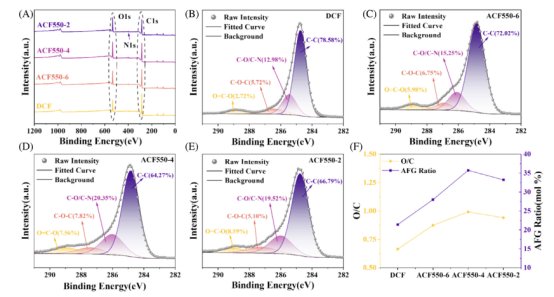 图4 等离子体处理前后CF的XPS (A) DCF、ACFSS0-6、ACF550-4、ACF550-2的XPS扫描全谱图;(B-E)DCFACF550-6、ACF550-4、ACF550-2的XPS 扫描 C15 拟合國谐,(D DCF、ACFSS0-6、ACF550-4、ACF550-2的O/C比值和活性官能团比率[1]