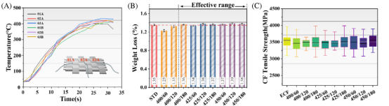 图1 (A)热电偶测量红外加热去浆CFF温座均匀性;(B) STD和不同工艺参数下红外加热去浆率;(C)不同红外加热工艺参数CF单丝强度[1]